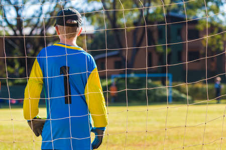 Young goalkeeper boy standing guard in front of his team goal during an outdoor game, good for school sport or heathy kid theme