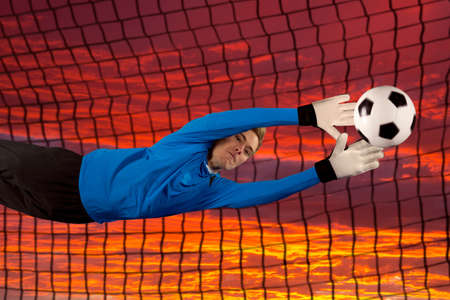 Football goalkeeper catching soccer old ball on blue sky with clouds