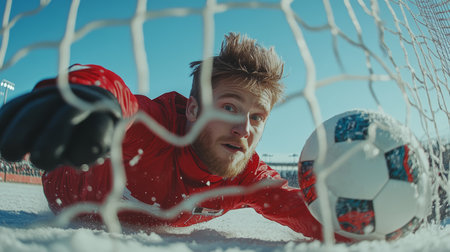 Goalkeeper Makes Diving Save, Soccer Game Winning Goal, Net and Snow, Sports Photography