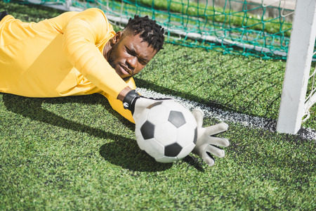 african american goalkeeper catching ball during soccer match