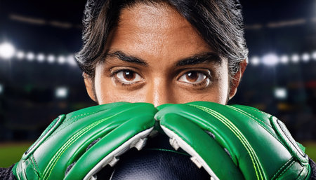 A young athlete reveals intense focus and readiness in goalkeeping attire during a match.