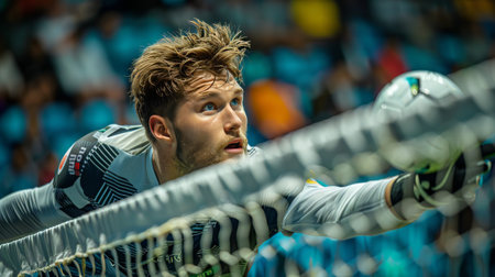 Focused goalkeeper stretches to block incoming ball with skill and determination during critical tournament play. Concept of professional sport, culture, challenge, tournament, action.
