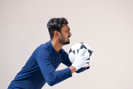 Portrait of young man football player goalkeeper wearing gloves holding soccer ball.