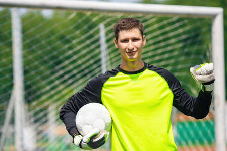 Portrait man Goalkeeper soccer man with ball