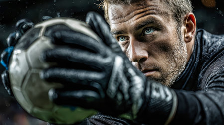 Focused soccer goalkeeper preparing for penalty crisp details