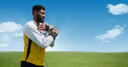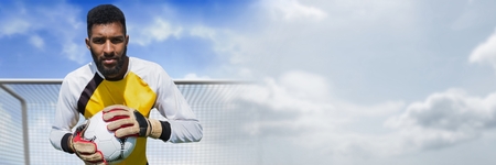 Digital composite of Goalkeeper holding football with clouds