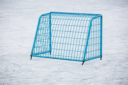 Soccer goalpost and net on practicing pitch as abstract sport and football background, selective focus
