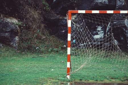 Old vacant football soccer goal gate in rural grass field in Chiang Mai,Thailand