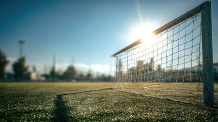 A stunning soccer goal framed by lush green grass under a beautiful sunrise, offering a serene atmosphere perfect for sports and outdoor recreational themes.