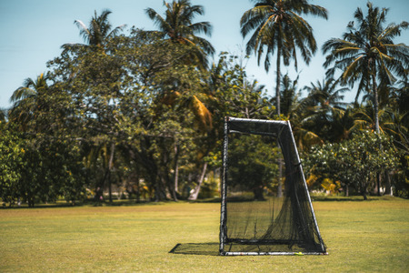 Outdoor side view of a small football or soccer gates for children and part of the field, with the palm trees and other different plants of a tropical resort in a defocused background