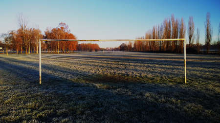Early morning in the amatuer soccer field. Football game playground in autumn foggy morning. Sunlight in the background