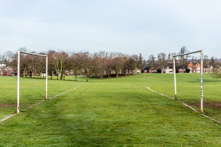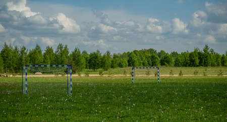 Football goalpost, gate and green lawn without players. Pandemic problem, social distance, home sef-isolation and self-care concept.