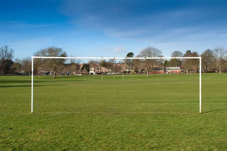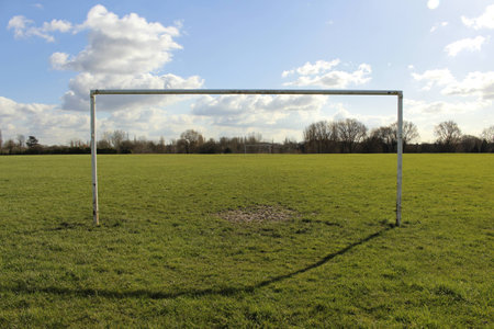 A soccer goal frame stands on vibrant green turf in an outdoor field setting, capturing the essence of recreation and sports under a clear blue sky. Perfect for various themes.