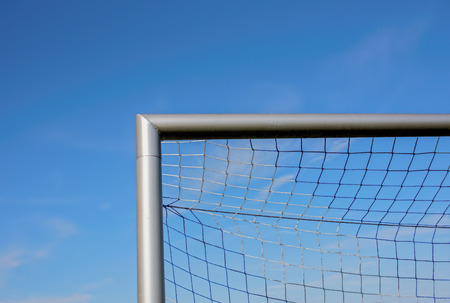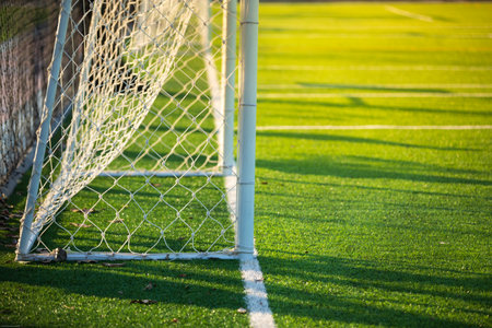 Soccer goalpost and net on practicing pitch as abstract sport and football background, selective focus