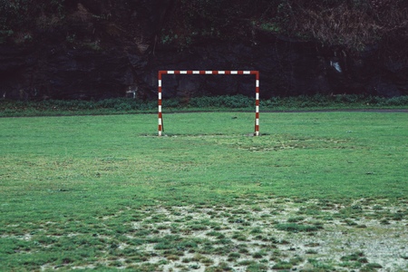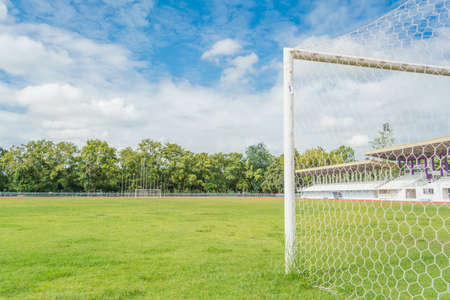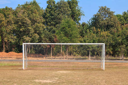 Old vacant football soccer goal gate in rural grass field in Chiang Mai,Thailand