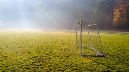 A soccer goal stands in a quiet field at sunrise, surrounded by bare trees and dewy grass.