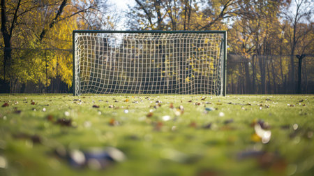 A soccer goal net stands alone on a green grass field, with fallen leaves scattered across the ground. The background is a blurred view of a forest with trees in autumn colors.