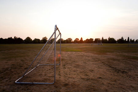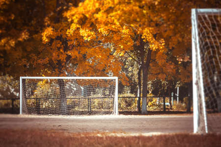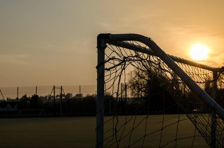 fall football and soccer goal. Soccer sunset. Football in the sunset