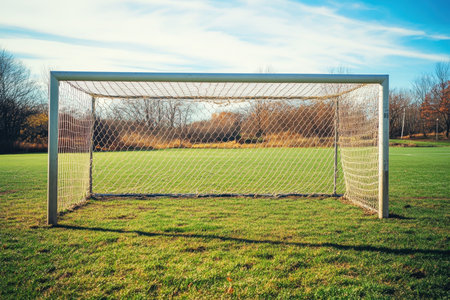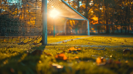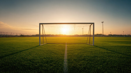 A stunning soccer goal framed by lush green grass under a beautiful sunrise, offering a serene atmosphere perfect for sports and outdoor recreational themes.