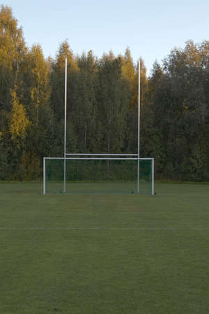 Rugby and gaelic football pitch with tall goalposts in Ireland.