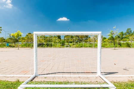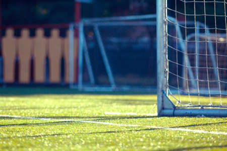 Soccer goal on field with artificial green grass. Summer outdoor game.