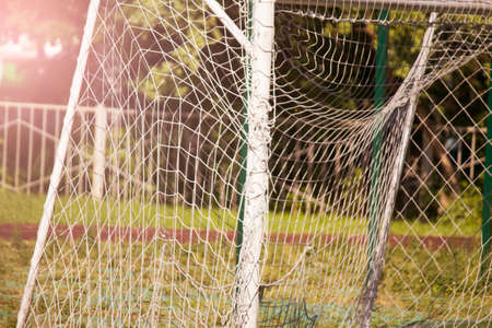 Football backgeound. Soccer football equipment. White soccer net on a goal. Soccer net nodes. Blurred goalpost in the background