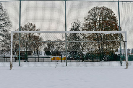 A snow-covered football goal. The concept of the end of the football season, the football league and the end of the sports season.