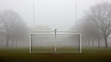 An empty football field shrouded in thick fog creates a serene atmosphere. The goal post stands prominently against the mist, capturing the essence of sports anticipation.