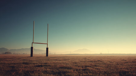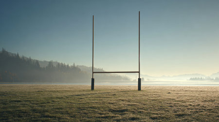A solitary rugby goalpost stands tall in a quiet field at dawn, with mist floating above the grass and mountains in the background, embodying tranquility and nature.