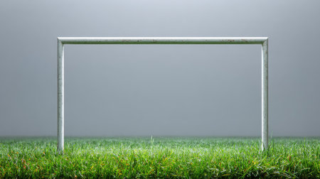 A solitary soccer goalpost rises from lush green grass on a foggy day, creating a scene filled with potential and inspiration for sports lovers and enthusiasts.