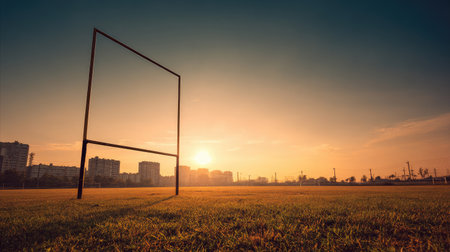 A breathtaking view of an empty rugby field at sunset with goalposts silhouetted against a warm, colorful sky, creating a serene and tranquil atmosphere.