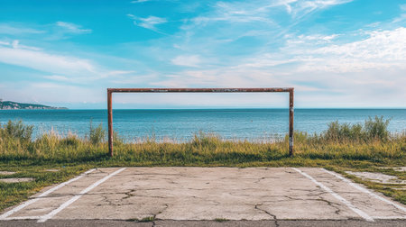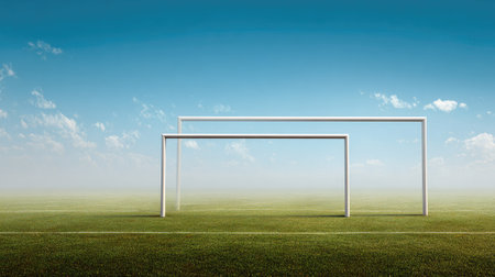 A striking image of two minimalist soccer goalposts on a lush green field under a bright blue sky, embodying themes of competition, sports, and recreation.