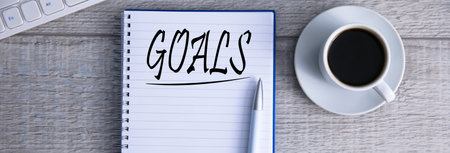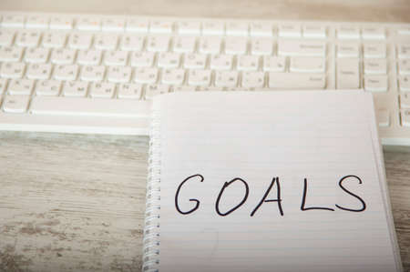 Top view of goals journal with handwritten word Goals and pen on laptop backround. Setting goals and planning concept