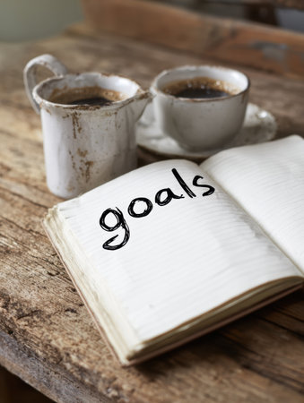 Two cups of coffee beside an open notebook displaying the word goals, inviting reflection and motivation during a peaceful morning moment.