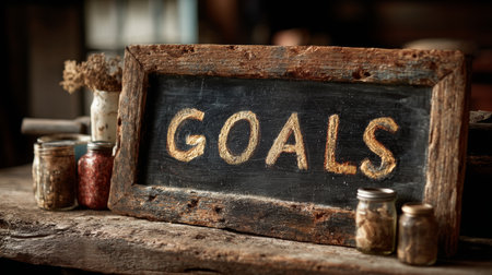 Chalkboard with 'goals' written on it, placed on a rustic wooden table.