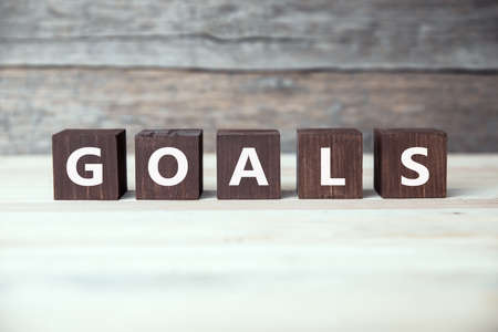 Motivational and inspirational word - GOALS written on wooden blocks. Blurred styled background.