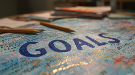 Goals in notepad lettering with red paints. Place for text. The concept of goals in painting and online drawing school. Case planning. Education motivation,inspiration. Top view, flat lay, mock up.