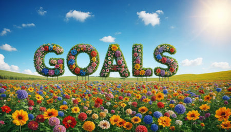 A vibrant workspace featuring a laptop with the word 'GOALS' prominently displayed, complemented by lush green plants and pens, ideal for motivating productivity and creativity.