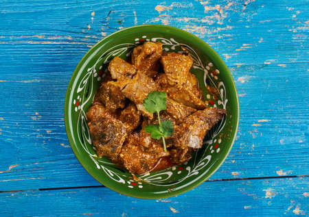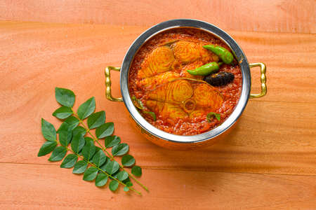 Seer Fish or king fish curry, ,kerala special dish arranged in a copper bowl garnished with curry leaves and fresh green chilli on a wooden textured background,isolated.