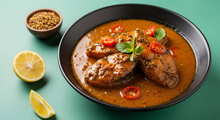 Deliciously prepared fish curry served in a dark bowl with fresh lemon wedges and spices