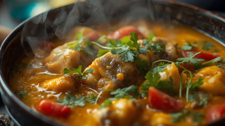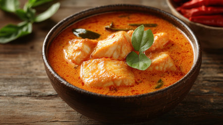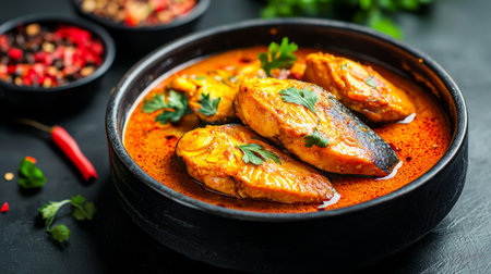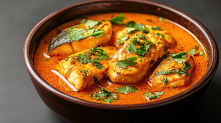 Indulge in this vibrant fish curry, featuring succulent pieces of fish simmered in a spicy coconut sauce, garnished with fresh herbs and served in a rustic bowl.