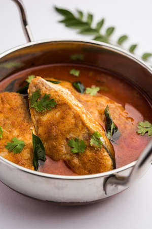 Traditional Indian Kerala special fish curry arranged on a white bowl garnished with curry leaves on white background.