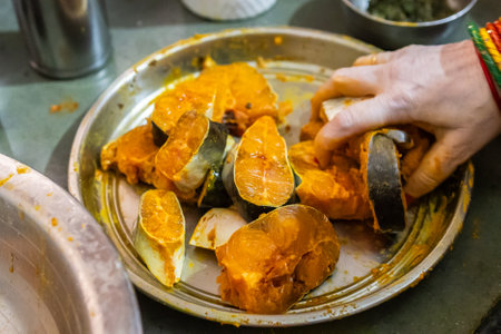 fresh fish marinating in spices at home in plat from different angle