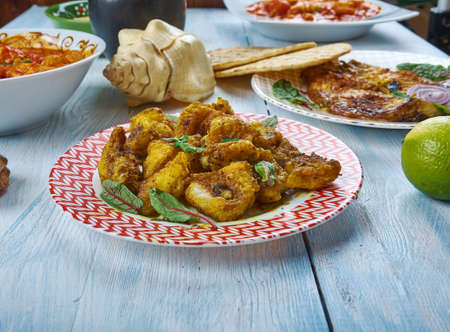 Chettinad Meen Varuval,Chettinad style fried fish, Kerala Style cuisine, Traditional assorted dishes, Top view.