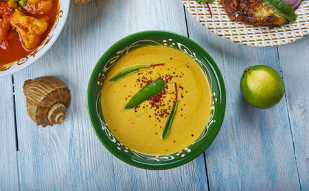 Pulishery,authentic Kerala gravy made with Yoghurt , Coconut, Kerala Style cuisine, Traditional assorted dishes, Top view.