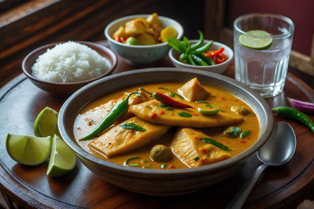 Bowl of fish curry with rice and lime on a wooden table