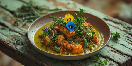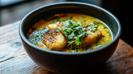 A flavorful fish curry served in a rustic bowl, topped with fresh herbs. This dish showcases vibrant colors and ingredients, perfect for a cozy meal.