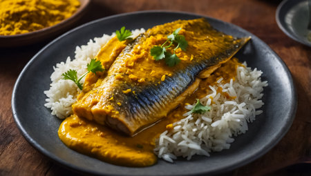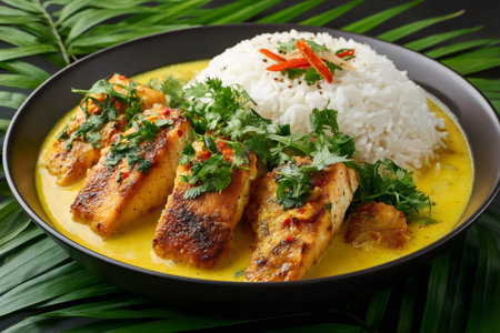 Savory fish curry showcases tender fillets in a rich, aromatic sauce, garnished with fresh herbs. Perfect for food lovers and culinary enthusiasts seeking inspiration.