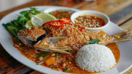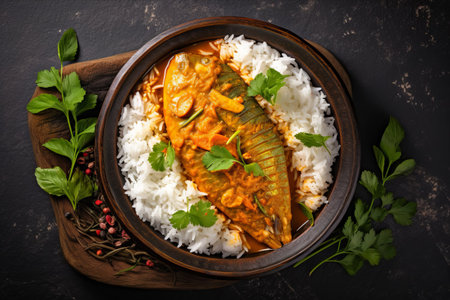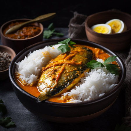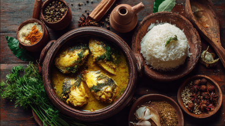 A vibrant scene featuring traditional fish curry paired with aromatic white rice, surrounded by a variety of spices and fresh herbs on a rustic wooden table.