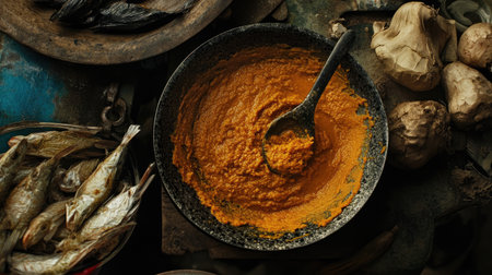 A vivid orange spice paste rests in a metal bowl, encircled by dried fish and fresh ingredients on a textured wooden surface, showcasing culinary artistry.